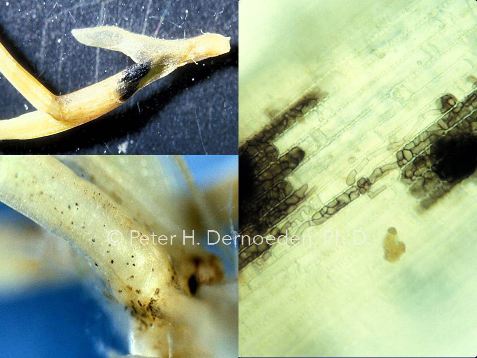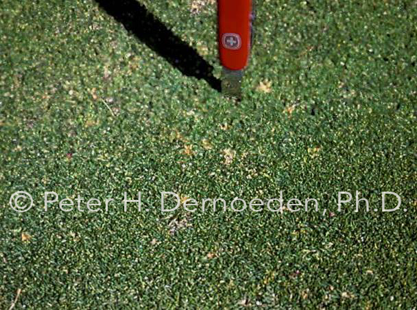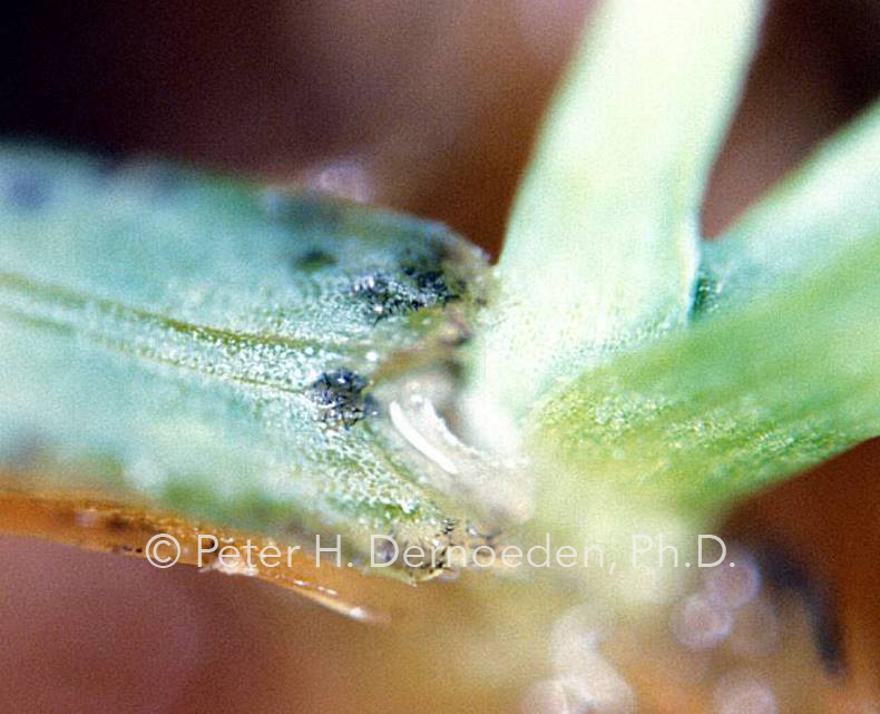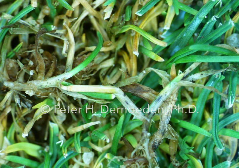 When discoloration or thinning is first observed, managers are advised to carefully look on lower sheaths and stem bases for the infection mats, which during the early stages of the disease, appear as small (pinhead sized), black “fly specks.” This involves good light and a steady hand to peal leaf sheaths to expose the whitish inner sheath tissues or stem areas. There will be no tell-tale signs or symptoms (like leaf spots) of the pathogen on leaf or sheath tissue during the early stages of basal rot. In advanced stages, black aggregates of fungal mycelium can be found on infected stolons or stem bases of creeping bentgrass and annual bluegrass. The spore bearing acervuli with short, black hairs and the black mycelial aggregates can be seen on stem bases and stolons with a hand lens. Once acervuli develop on sheath or leaf tissue, the basal rot phase is advanced and plants die