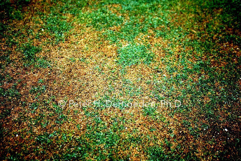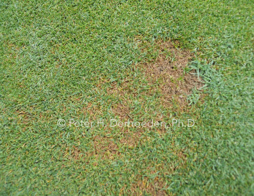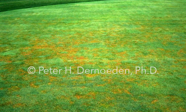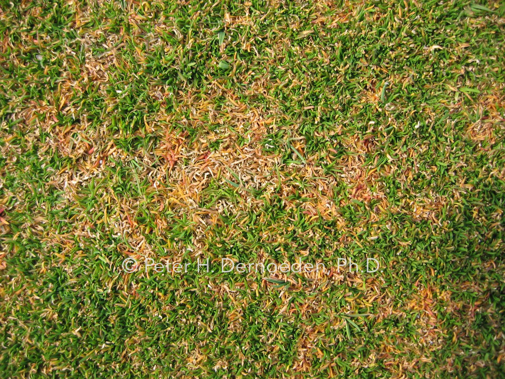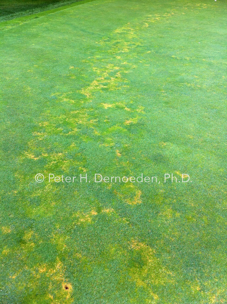In summer, affected turf initially develops a yellow, reddish-brown, or orange color and thins-out in irregularly-shaped patterns of varying size. Infected annual bluegrass plants often develop a brilliant yellow color before dying. The central or youngest leaf is last to show the yellow-orange color change. Large areas may thin or die-out completely, but distinctive leaf spotting is uncommon. Basal rot most often is associated with low mowing, soil compaction, traffic, wilt and low nitrogen fertility. This is because the pathogen is much more invasive if it enters stem tissues wounded by either mechanical damage or by extreme cold temperature stress –common to New England. In the mid-Atlantic, hot and dry weather followed by an overcast and/or rainy period can trigger or intensify the disease. Shaded and wet sites are particularly vulnerable.