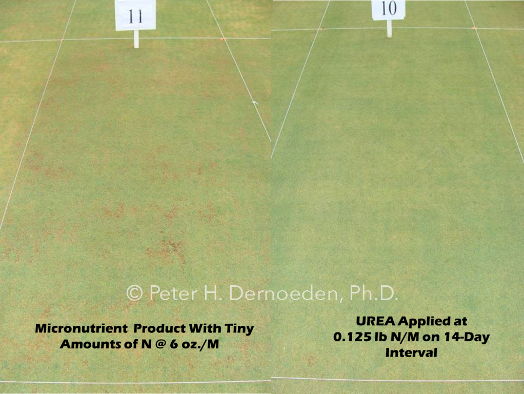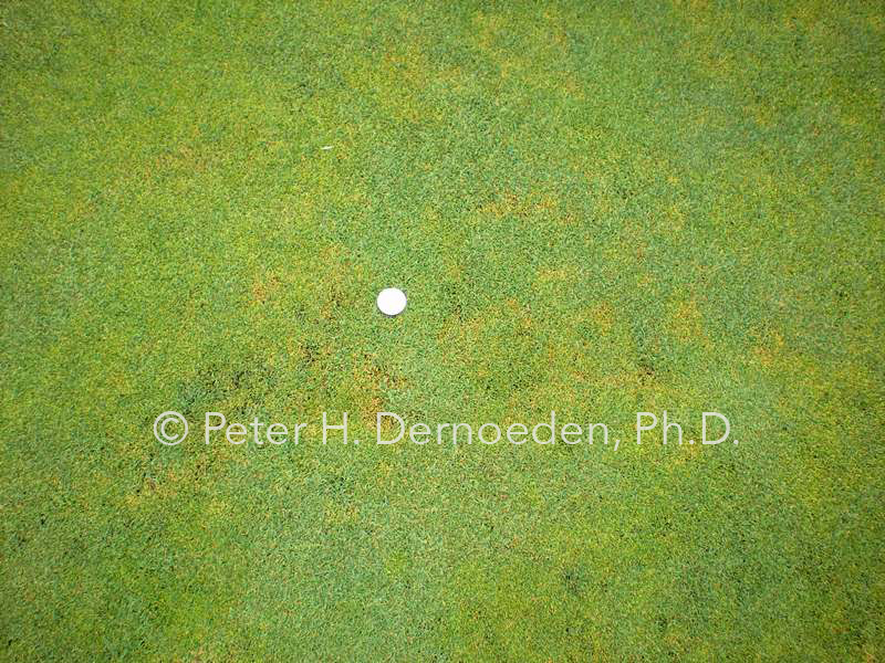 The worse scenario involves thunderstorm activity or heavy rain events in summer, which not only intensifies yellowing and thinning, but often is associated with the appearance of black algae [remembrance of Steve Potter, CGCS at Woodholme CC, Baltimore]. Basal rot is difficult to suppress once it becomes a chronic, spring or early summer problem in annual bluegrass greens. Infected Poa on greens often dies leaving pits in winter that remain a visual and bumpy problem, often inviting criticisms.