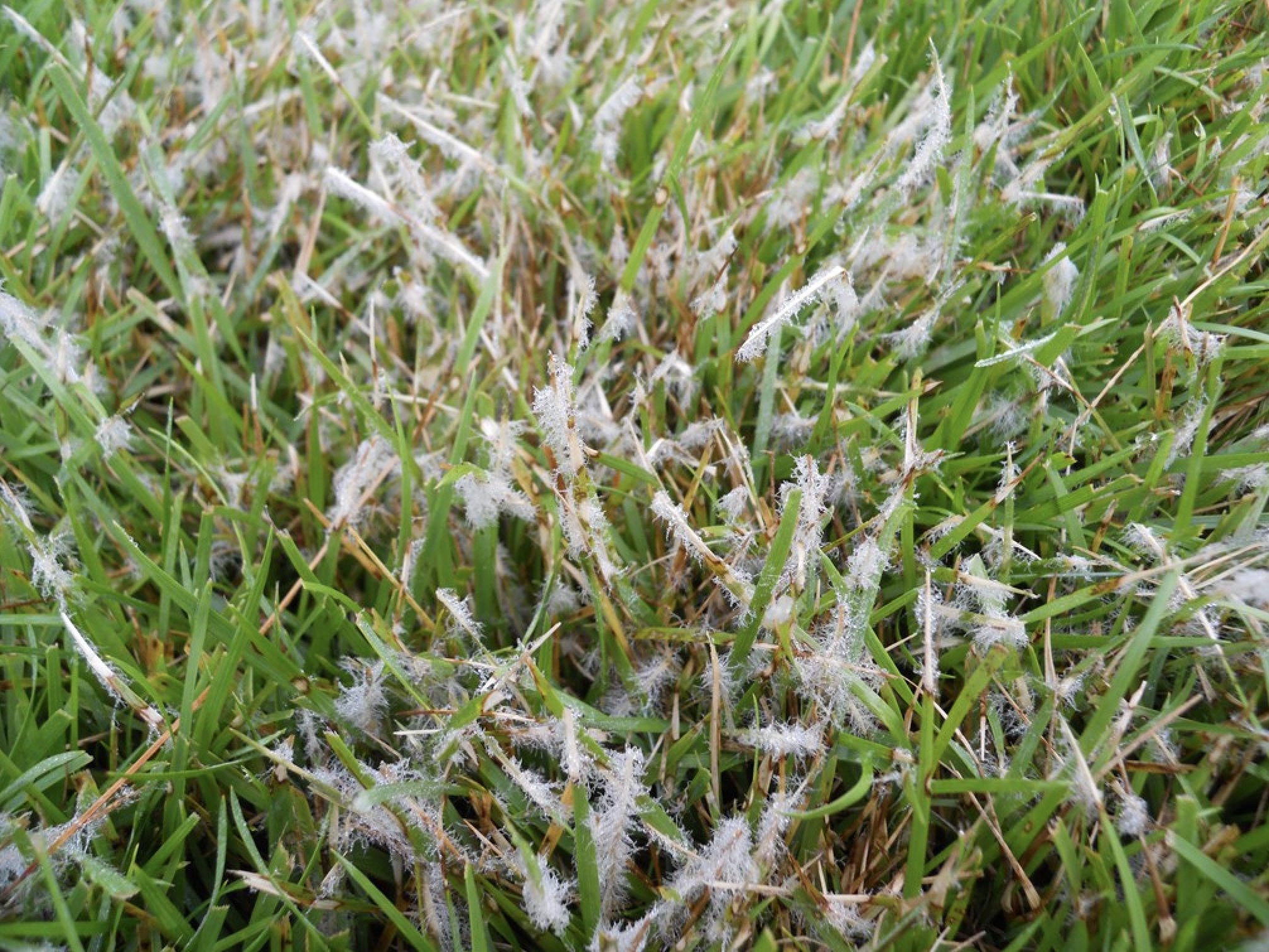 The dollar spot fungus can produce copious amounts of folair mycelium in most turfs, but it does not produce spores.